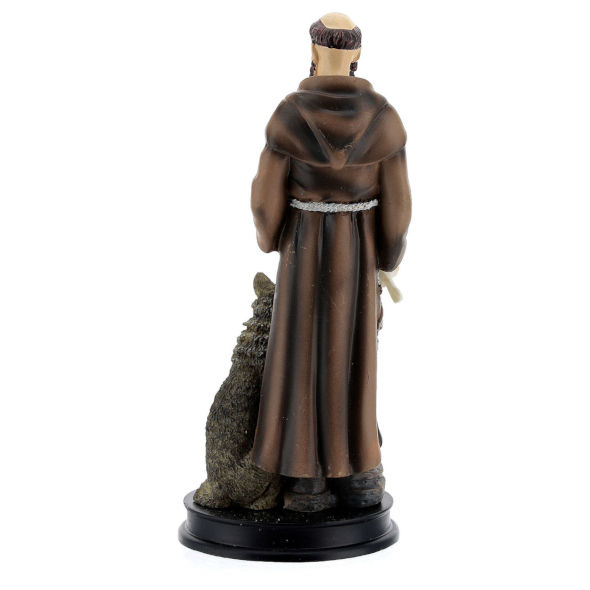 Statua in resina di 13 cm in altezza raffigurante  San Francesco d’Assisi con il lupo. La resina (rispetto al pvc) garantisce una migliore definizione alle statue una migliore definizione, sebbene sia un materiale più delicato rispetto al PVC. È consigliabile maneggiarla con cura.